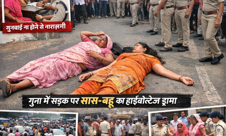 मध्यप्रदेश के गुना में सोमवार दोपहर सिटी कोतवाली के सामने उस समय हड़कंप मच गया, जब पुलिस की कार्यप्रणाली से नाराज़ सास-बहू बीच सड़क पर लेट गईं। हाईवोल्टेज ड्रामे के चलते व्यस्त सड़क पर लंबा जाम लग गया और मौके पर लोगों का भारी हुजूम जमा हो गया।